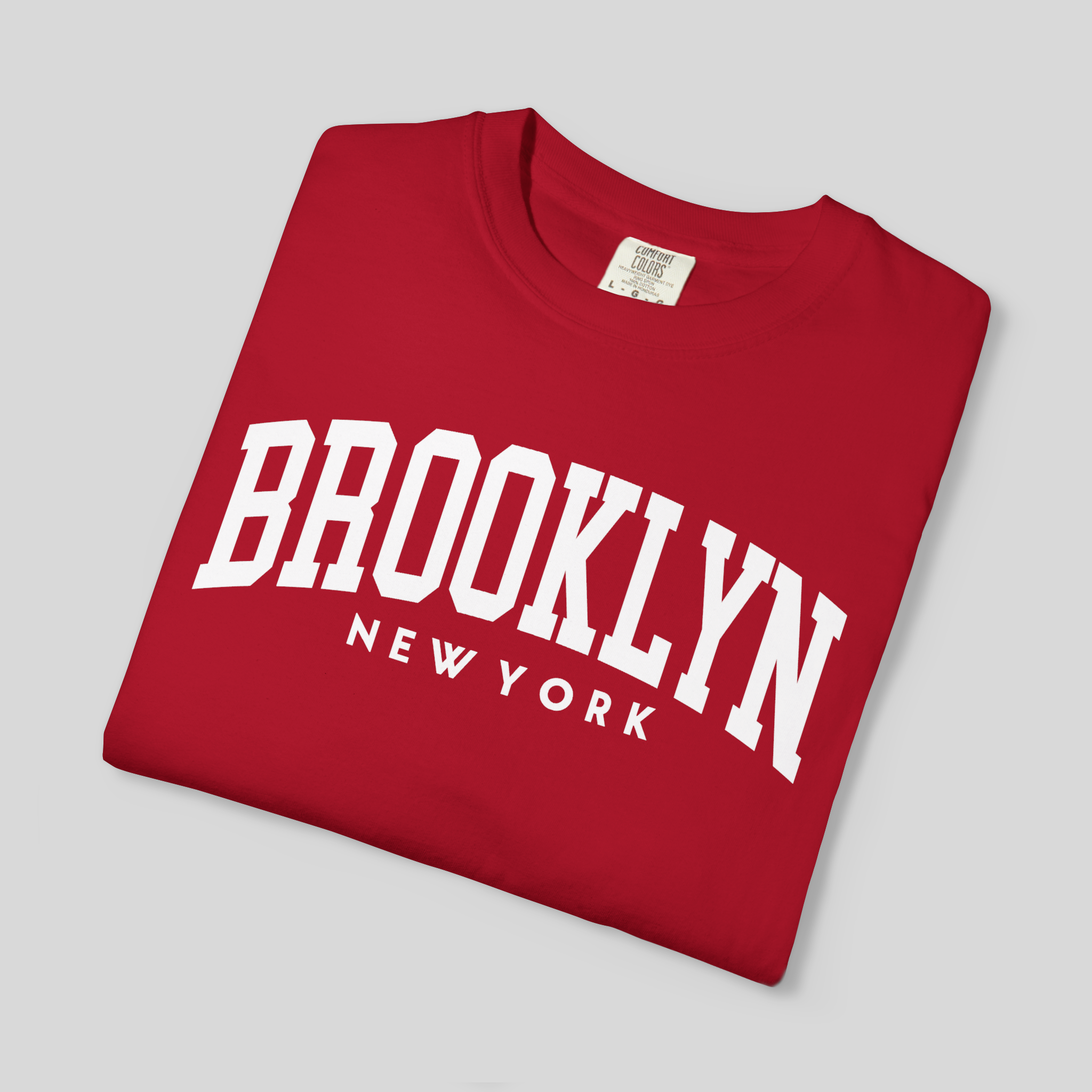 The Brooklyn Arch Tee features bold varsity-style lettering printed on a vibrant red canvas — a tribute to street culture, music, basketball, and the creative heartbeat of Brooklyn.