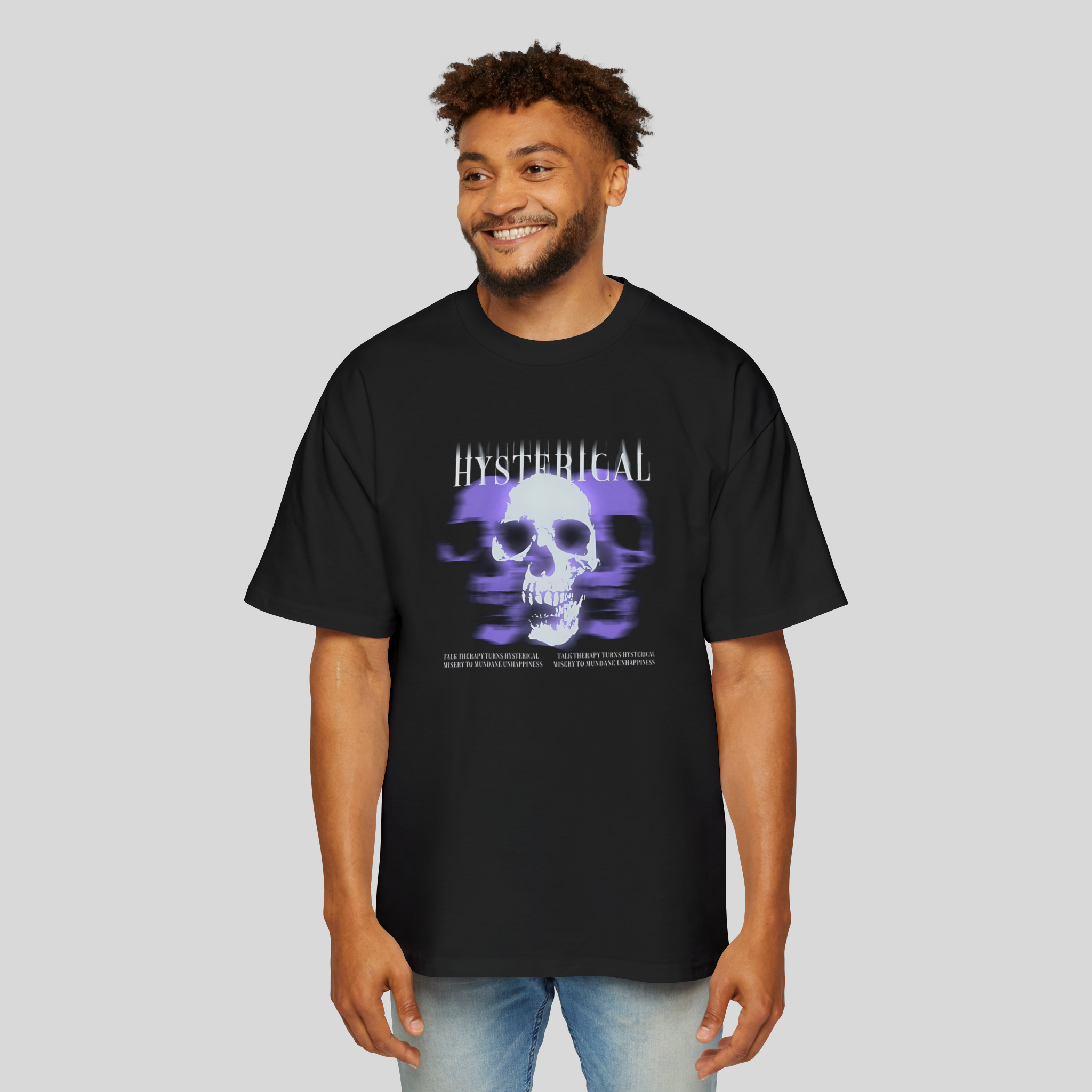 The Hysterical State Tee captures the chaos of the modern mind — a distorted skull layered with purple glitch effects, symbolising anxiety, overthinking, and the thin line between control and collapse.